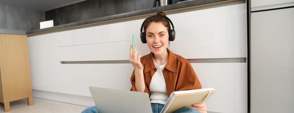Kurze Einträge nach jeder Session festigen Fortschritte. Leitfragen helfen, kleine Siege sichtbar zu machen. Poste eine Erkenntnis der Woche und motiviere Lernpartnerinnen zu konsequenter Reflexion.